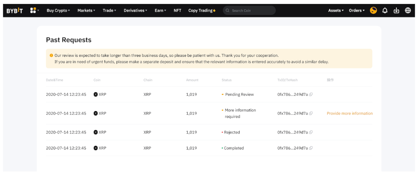 Por ejemplo, usted hizo un retiro de Exchange A a Bybit, por favor inicie sesión en Exchange A y muéstrenos los detalles del retiro. |