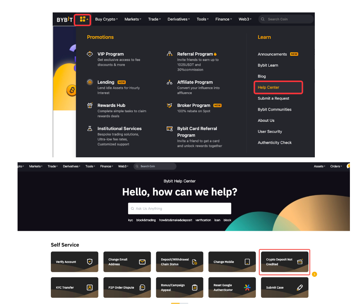 Paso 1: Pase el ratón por la esquina superior izquierda para buscar Centro de ayuda → Seleccione Criptodepósito no abonado, y será redirigido a la página de autoservicio.