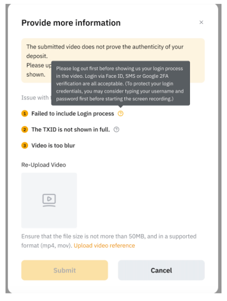 Paso 2: Se le pedirá que vuelva a enviar un vídeo con la información solicitada. Encontrará la solución correspondiente al pasar el ratón por encima del icono del signo de interrogación.
