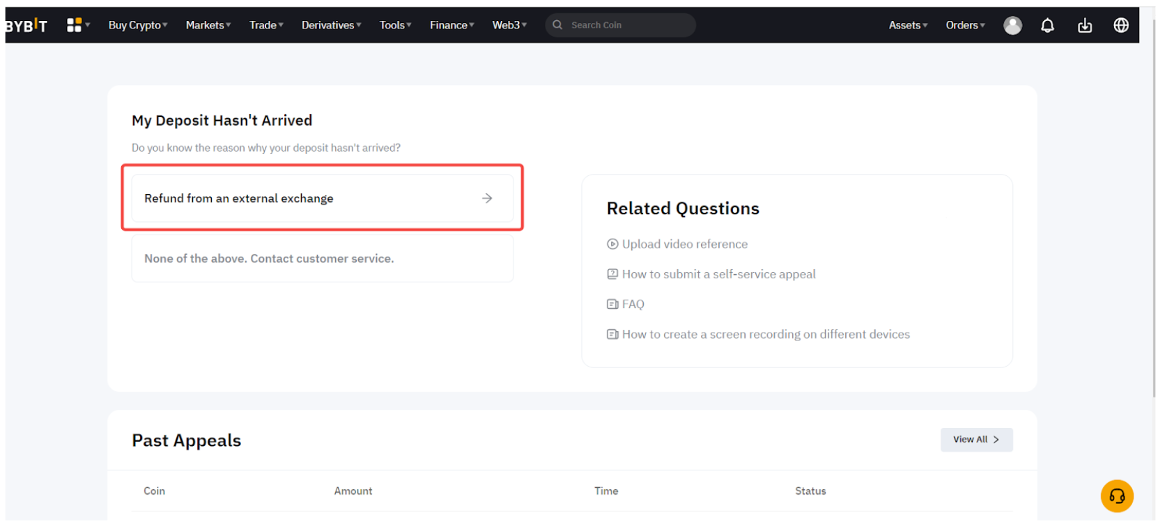 Una vez que haya obtenido todos los detalles del reembolso de la plataforma de intercambio correspondiente, puede consultar las siguientes instrucciones para presentar una apelación de autoservicio para su criptodepósito en Bybit.