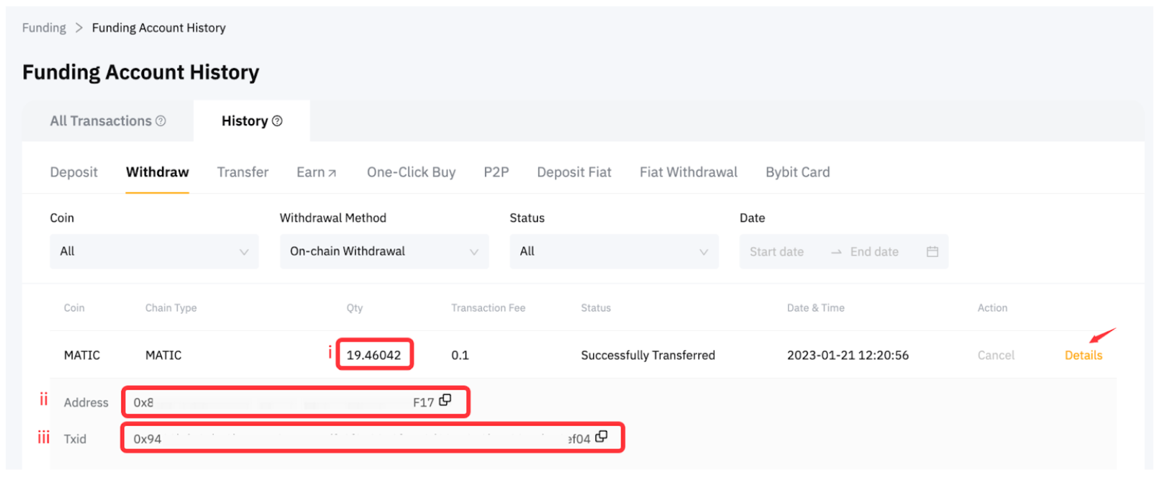 c. Detalles de su retiro de Bybit - Los detalles se pueden encontrar aquí.