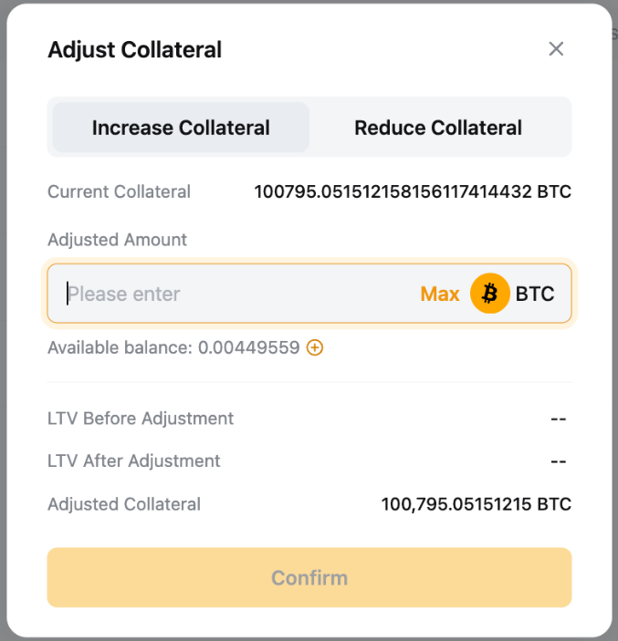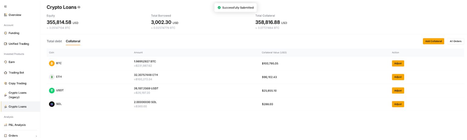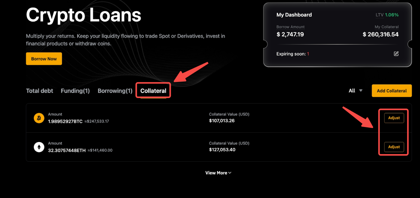 Atau, klik Aset → Pinjaman Kripto di sudut kanan atas halaman. Di bawah tab Pinjaman Kripto, klik Sesuaikan Jumlah Jaminan di kolom tempat Anda ingin menyesuaikan.