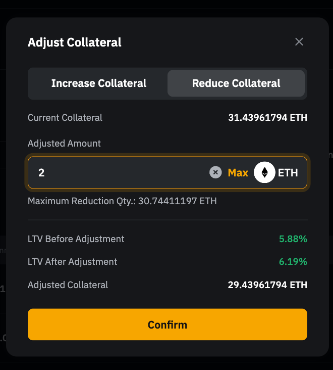 LTV Likuidasi Tertunda: Saat ambang batas LTV Likuidasi Tertunda tercapai, likuidasi tidak akan segera terjadi. Sebagai gantinya, masa tenggang 24 jam akan diberikan, di mana Anda dapat menambahkan jaminan atau sebagian melunasi pinjaman Anda untuk mengurangi LTV Anda kembali ke tingkat LTV Awal. Jika LTV Anda tetap pada atau di atas tingkat LTV likuidasi yang tertunda selama masa tenggang, atau jika melebihi LTV Likuidasi pada titik mana pun, likuidasi segera akan dipicu.