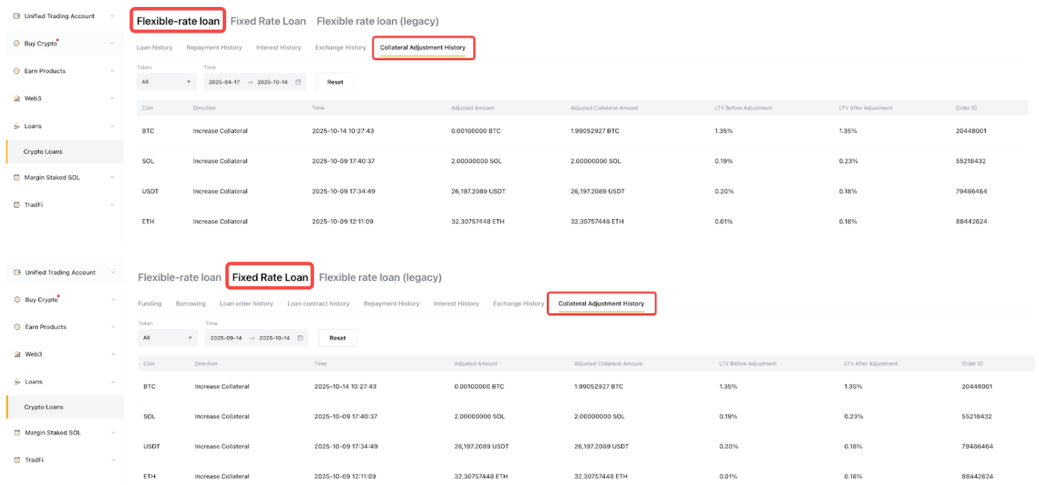 Anda dapat melihat perubahan rasio LTV dari Liabilitas — Riwayat Fleksibel/Tetap → Riwayat Penyesuaian Jaminan.