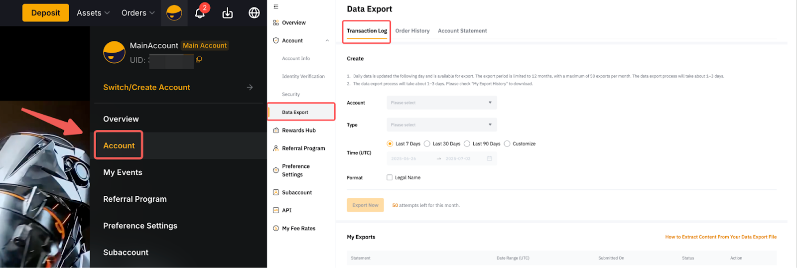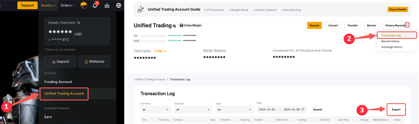 Step 1: You can also export the transaction log via your Unified Trading Account. To do so, go to Assets → Unified Trading Account → History Records → Transaction Log → Export.