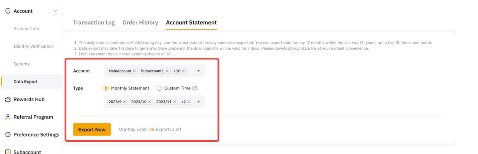 - Up to three (3) years of recent data can be retrieved. However, the export period is limited to one year (12 months), with a maximum of 50 exports per month for all the data types. For example, if you have requested data export for both Transaction Log and Account Statement, you will have 48 remaining exports within that month.