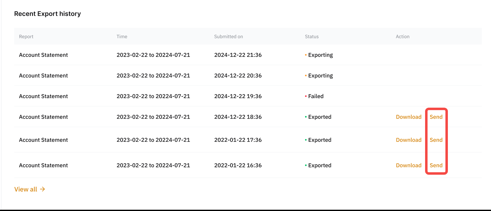 Step 2: Once the file is ready to export, the status will change to Exported, and the Download and Send buttons will become available. An email notification will also be sent to your registered email address. Click Send to continue.