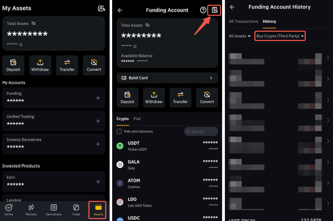 У мобільному додатку перейдіть на вкладку Активи → Фінансування, потім натисніть піктограму Історія у верхньому правому куті та виберіть Купити криптовалюту (третя особа).