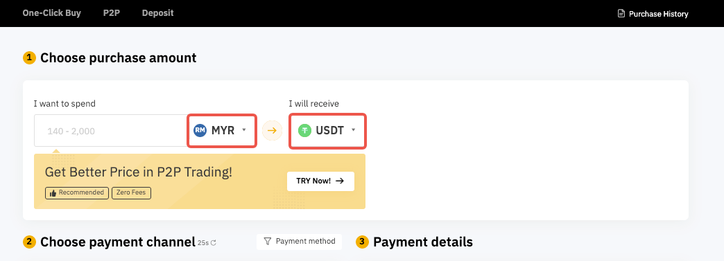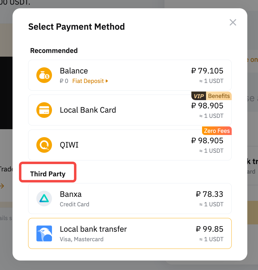 Список підтримуваних фіатних і криптовалют, а також доступних сторонніх способів оплати можна знайти на сторінці Купівля в один клік. Крім того, ви можете переглянути сторінку ордерів третьої сторони, натиснувши на розкривний список фіатних валют або криптомонет.