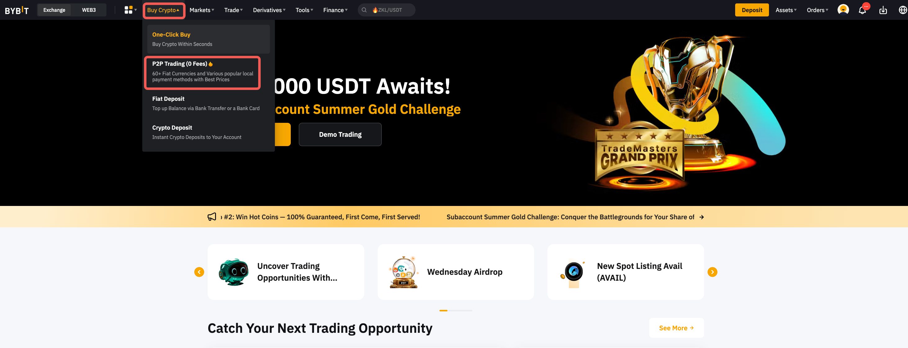 Bước 1: Vui lòng nhấp vào Mua Crypto → Giao Dịch P2P ở góc trên cùng bên trái của thanh điều hướng để vào trang giao dịch P2P.