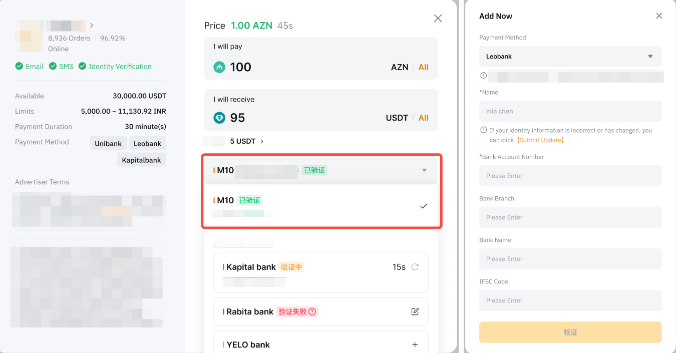 Đối với các giao dịch liên quan đến người dùng có Xác minh Cá nhân là tiền tệ AZE  hoặc AZN, cần có quy trình xác minh thông tin tài khoản ngân hàng của bạn. Vui lòng đảm bảo nhập chi tiết tài khoản ngân hàng sẽ được sử dụng để nhận thanh toán của bạn.
