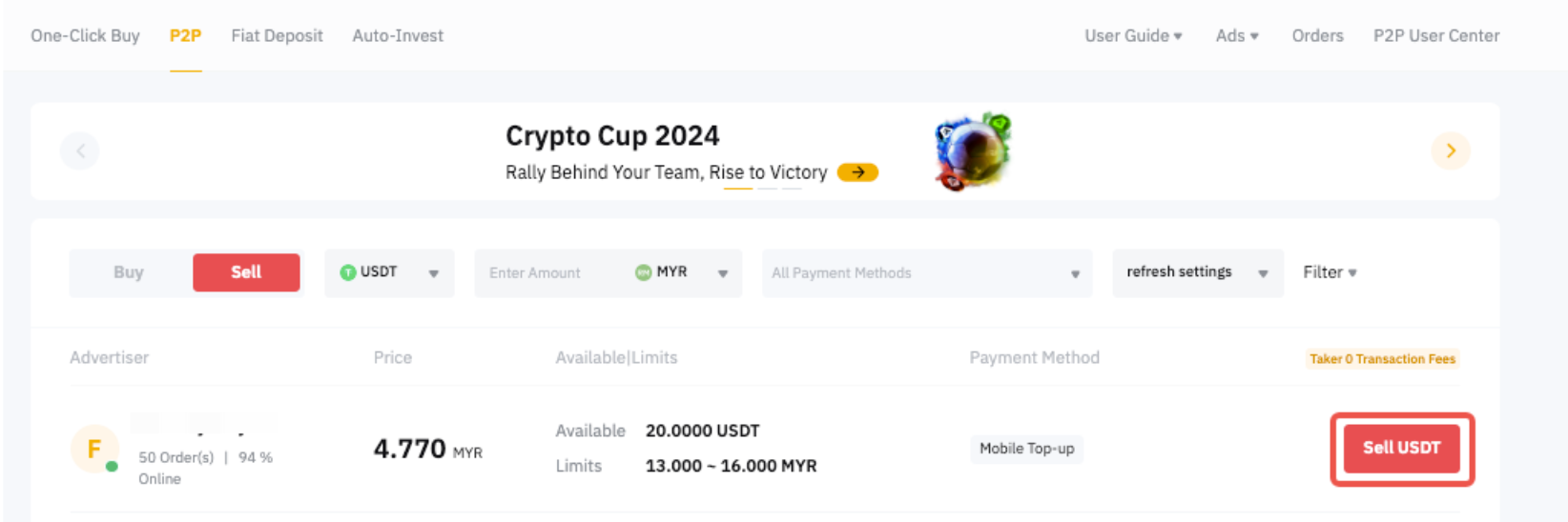 Bước 2: Trên trang Bán, bạn có thể lọc các nhà quảng cáo bằng cách nhập các tiêu chí mong muốn về Loại Coin, Số Tiền, Tiền Fiat, Phương Thức Thanh Toán, v.v., dựa trên nhu cầu giao dịch của bạn.