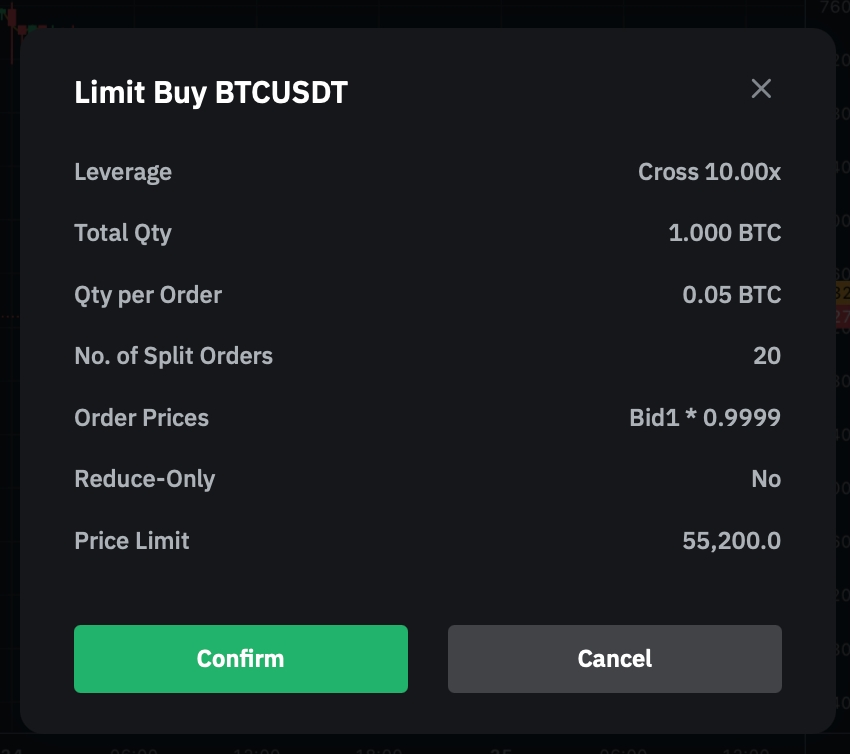 Trên Bybit, có hai (2) cài đặt chia nhỏ và bốn (4) tuỳ chọn đặt lệnh dành cho nhà giao dịch.