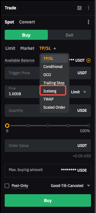 Bước 1: Truy cập trang giao dịch bạn muốn giao dịch, sau đó chọn lệnh Iceberg.