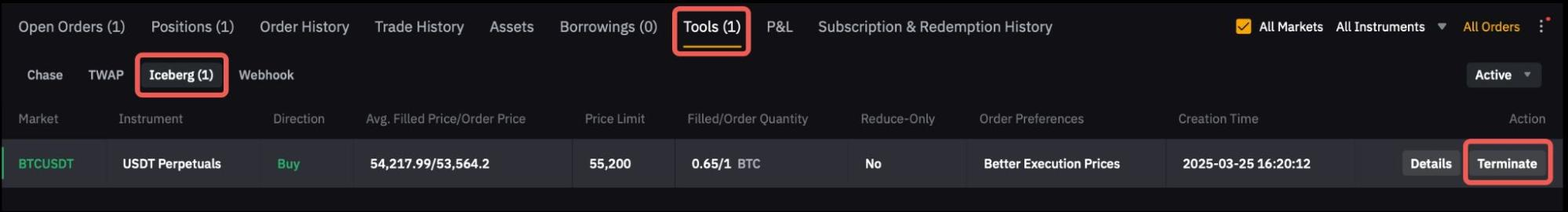 Để đóng Lệnh Iceberg, nhấp vào Công Cụ và chọn Chấm Dứt trong tab vị thế.