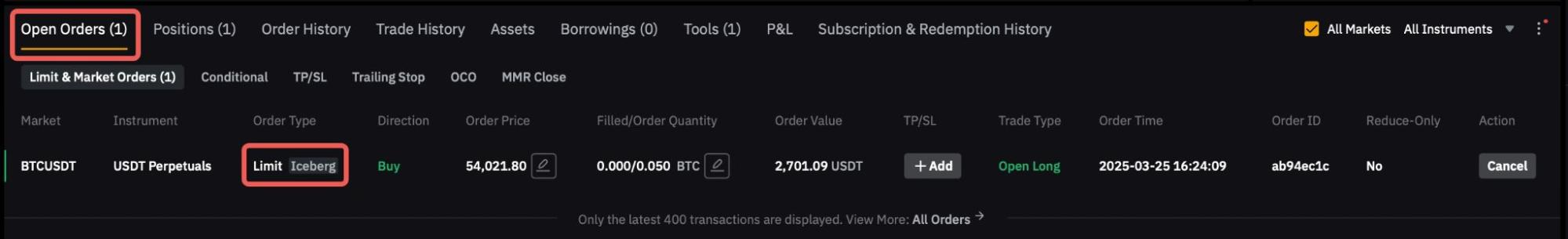 — Lệnh Iceberg được hỗ trợ trong cả Tài Khoản Chính và Tài Khoản Phụ. Mỗi tài khoản được giới hạn tối đa 10 Lệnh Iceberg và mỗi cặp giao dịch chỉ có thể mở 1 Lệnh Iceberg.