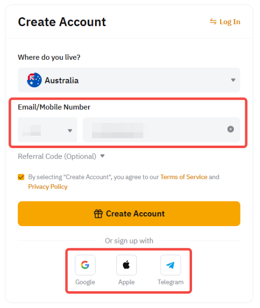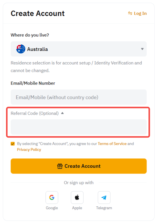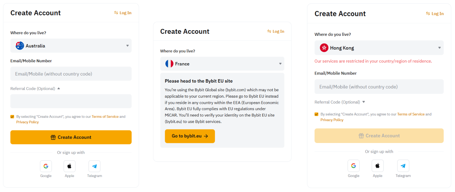 Bạn cũng có thể nhấn vào các nút Đăng ký bằng để dễ dàng tạo tài khoản Bybit của mình bằng cách sử dụng: