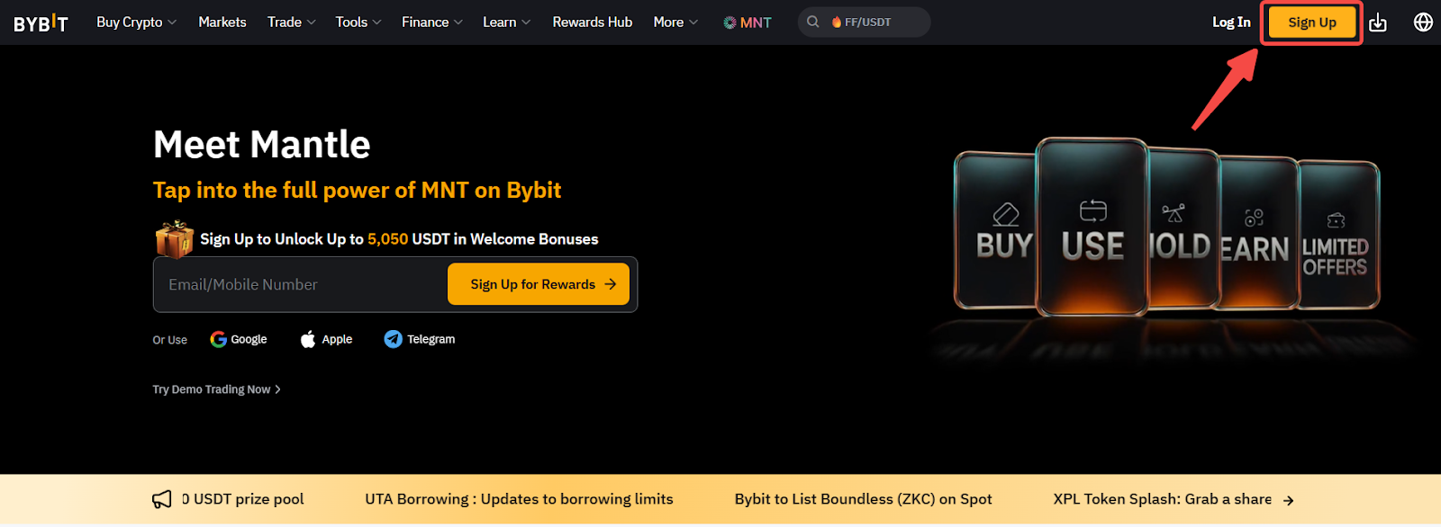 Bước 1: Trên trang chủ trang web Bybit, nhấp vào Đăng ký ở góc trên cùng bên phải để truy cập trang Đăng ký.