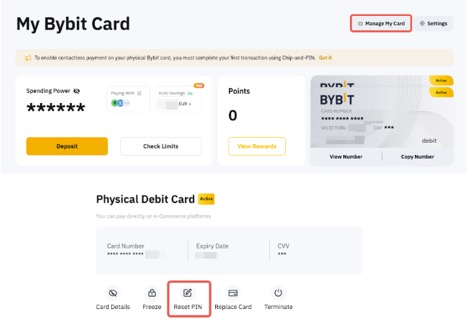 على موقع Bybit، يرجى التوجه إلى إدارة البطاقات الصفحة. انقر على المزيد → إعادة تعيين PIN وأكمل التحقق الأمني.