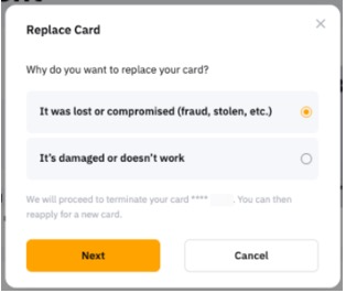 اختر هذا الخيار عندما تتعرض بطاقة Bybit الخاص بك للاختراق. عند تأكيد الخيار، سيتم إنهاء بطاقة Bybit المادية الخاصة بك ويمكنك تقديم طلب للحصول على بطاقة جديدة.