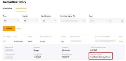 للتحقق من سبب الرفض، اذهب إلى سجل المعاملات لبطاقتك Bybit→ الترخيص → تفاصيل المعاملة المعنية.
