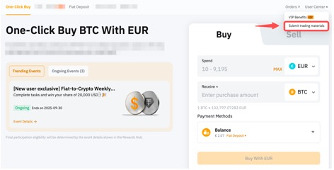 الخطوة 2: انقر على تقديم مواد التداول تحت مركز المستخدم في الزاوية اليمنى العليا من صفحة الشراء بنقرة واحدة.