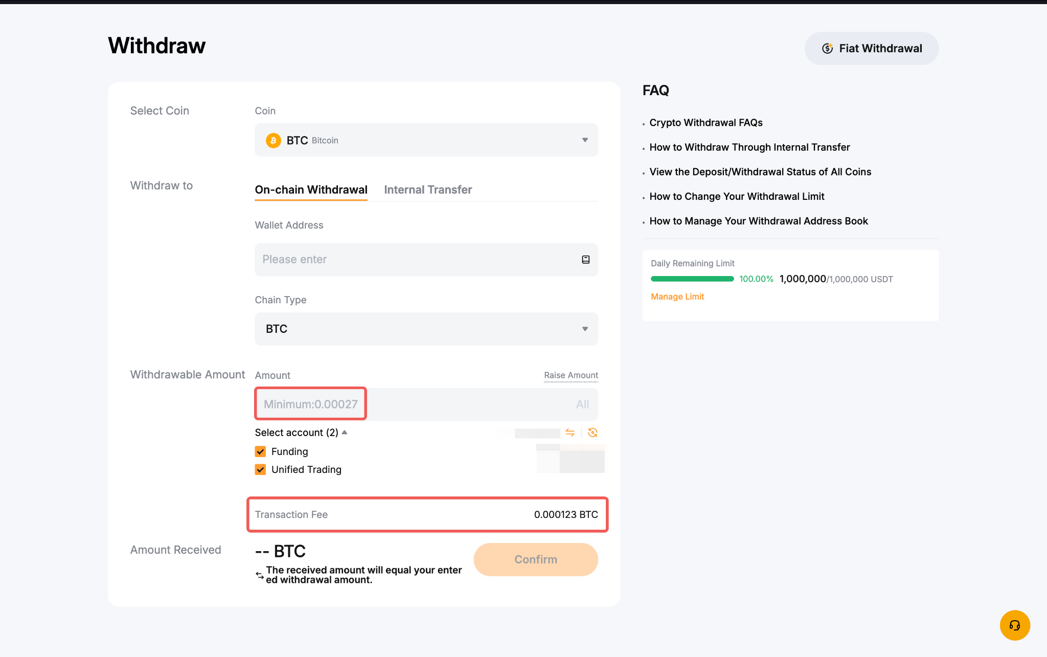 A Withdrawal Fee will be charged for on-chain withdrawal depending on the different coins and chains selected. You can see the minimum withdrawal amount and withdrawal fees stated on the withdrawal window. Please note that the withdrawal fee is fixed for any withdrawal amount.