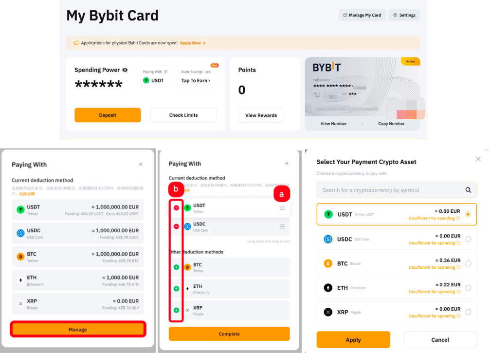 You can select up to 3 types of payment crypto for your Bybit Card transactions and the default payment priority is USDT > USDC > TON > BTC > ETH > XRP. However, you can manage your spending currencies, including adding, removing, or changing the order on the Card Dashboard page.