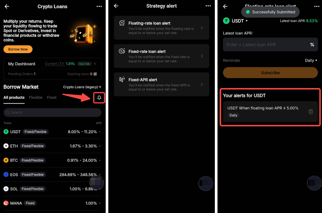 Once renewed, the system will automatically create a new borrowing and the repayment deadline will still remain the same as your borrowing duration. You’ll need to review your collateral, LTV (Loan-to-Value ratio), and repayment due date before confirming your renewal order.