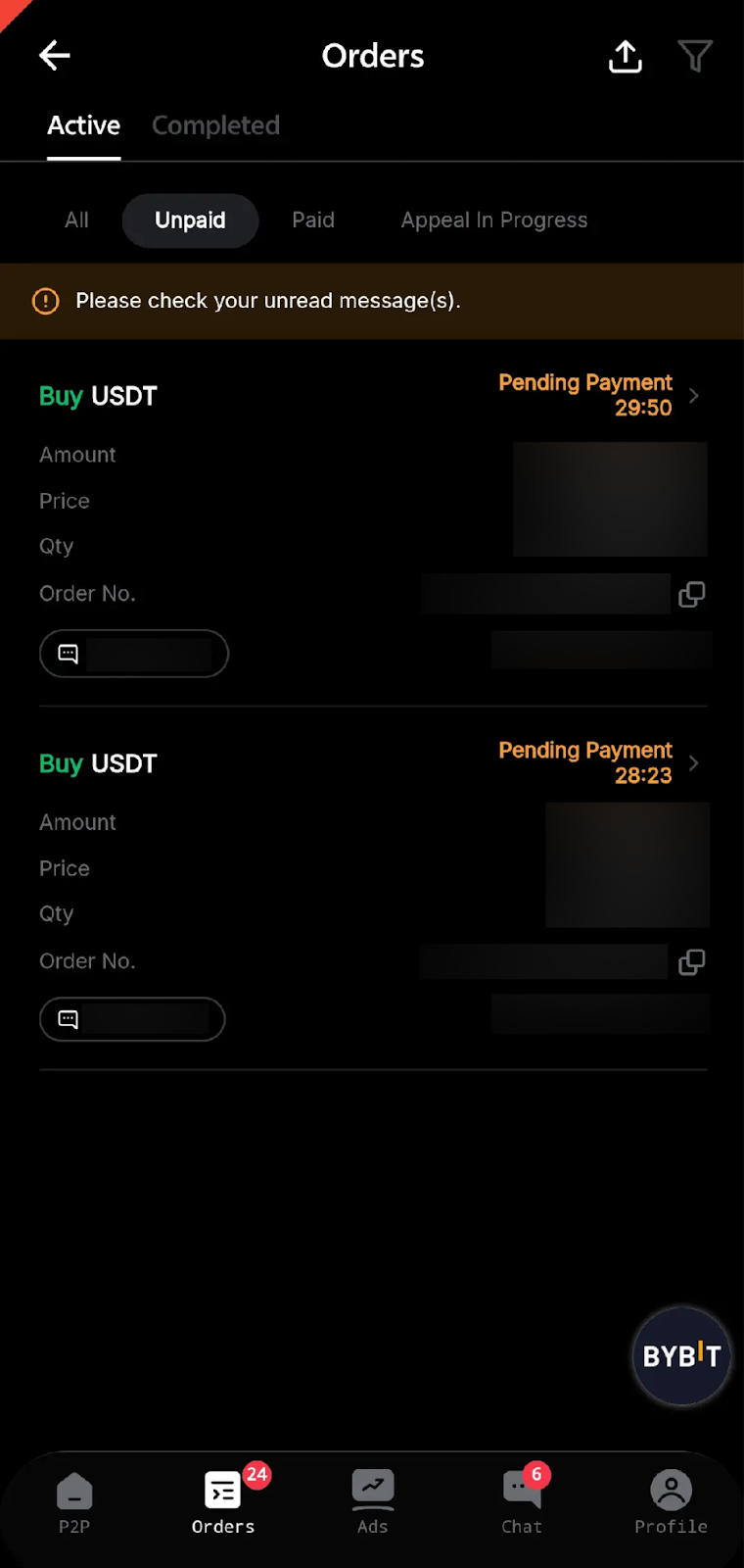 — Failing to transfer the funds to the Seller within the set timer in your Bybit account will automatically cancel your order.