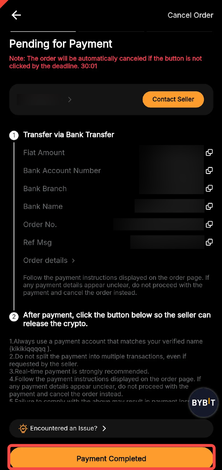 Ensure that you transfer the correct amount to the correct account using the specified payment method, and that the bank account used matches your verified KYC name on Bybit. Once completed, click Payment Completed to notify the seller.