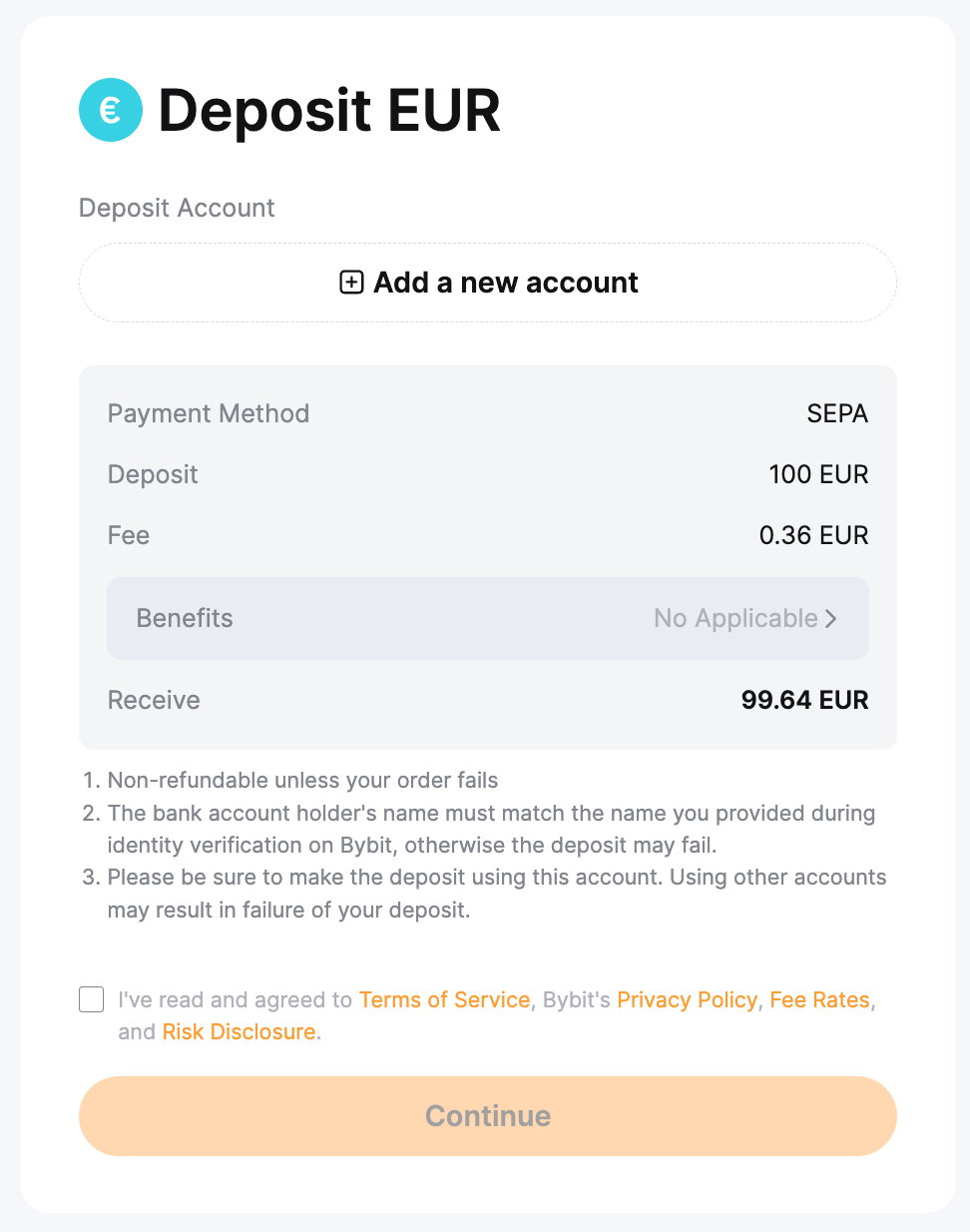 Before making a payment on the payment details page, you must provide your full name and an IBAN account that matches the KYC information on Bybit. A virtual account will be created for you to receive funds on Bybit.