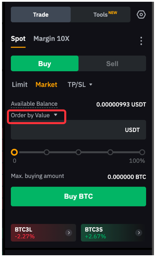 For market buy and sell orders, the default is to place an order by value (market buy) and by quantity (market sell). You can click on Order by Value or Order by Qty to switch your order placement preferences.