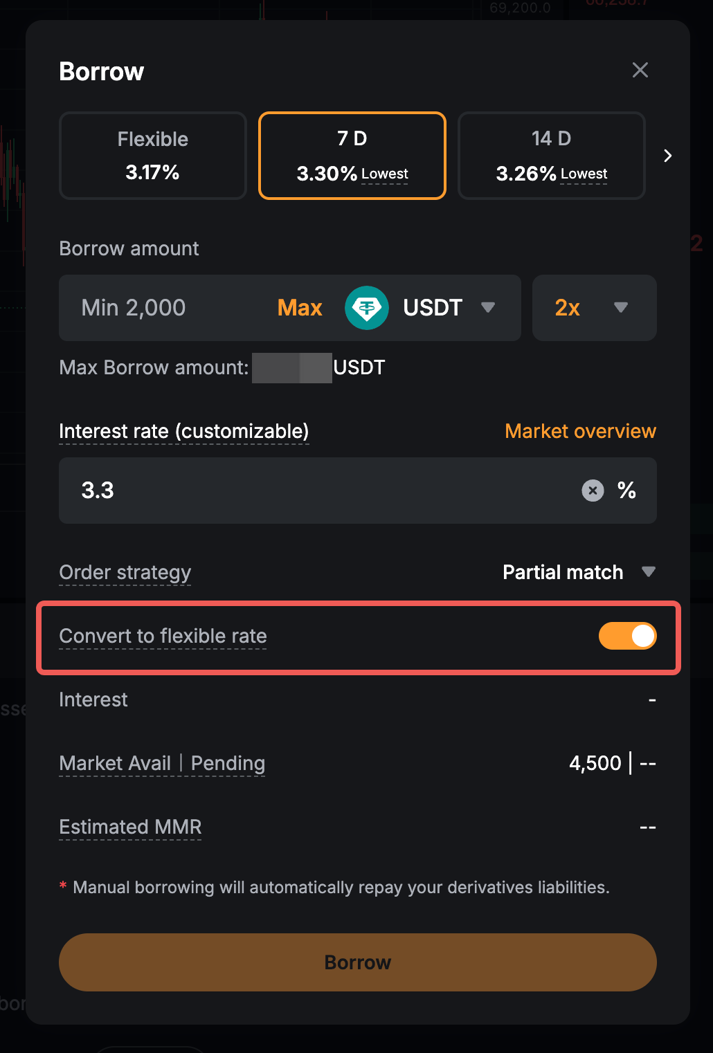 Anda dapat meminjam aset secara manual dari laman Perdagangan Margin Spot atau laman Aset UTA. Pilihan jangka waktu fleksibel dan beberapa pilihan jangka waktu tetap didukung, termasuk jangka waktu 7, 14, 30, 60, 90, dan 180 hari. Setelah dipinjam, jumlah aset ditambahkan ke saldo dompet Anda dan terhitung sebagai liabilitas.