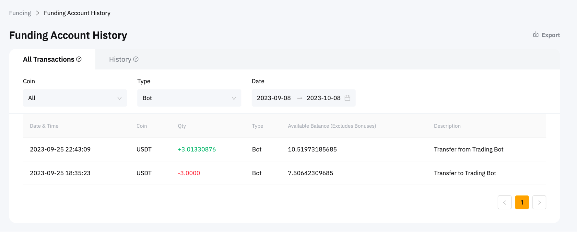 Klik Aset → Akun Pendanaan → Riwayat → Jenis Filter ke Bot di laman Semua Transaksi.