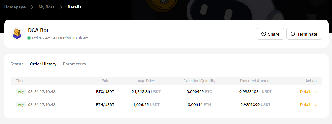 Saat ini, Anda dapat memiliki hingga 50 bot perdagangan — bot DCA dan bot Grid Spot — yang berjalan secara bersamaan. Beberapa bot DCA dapat dibuat untuk koin yang sama.
