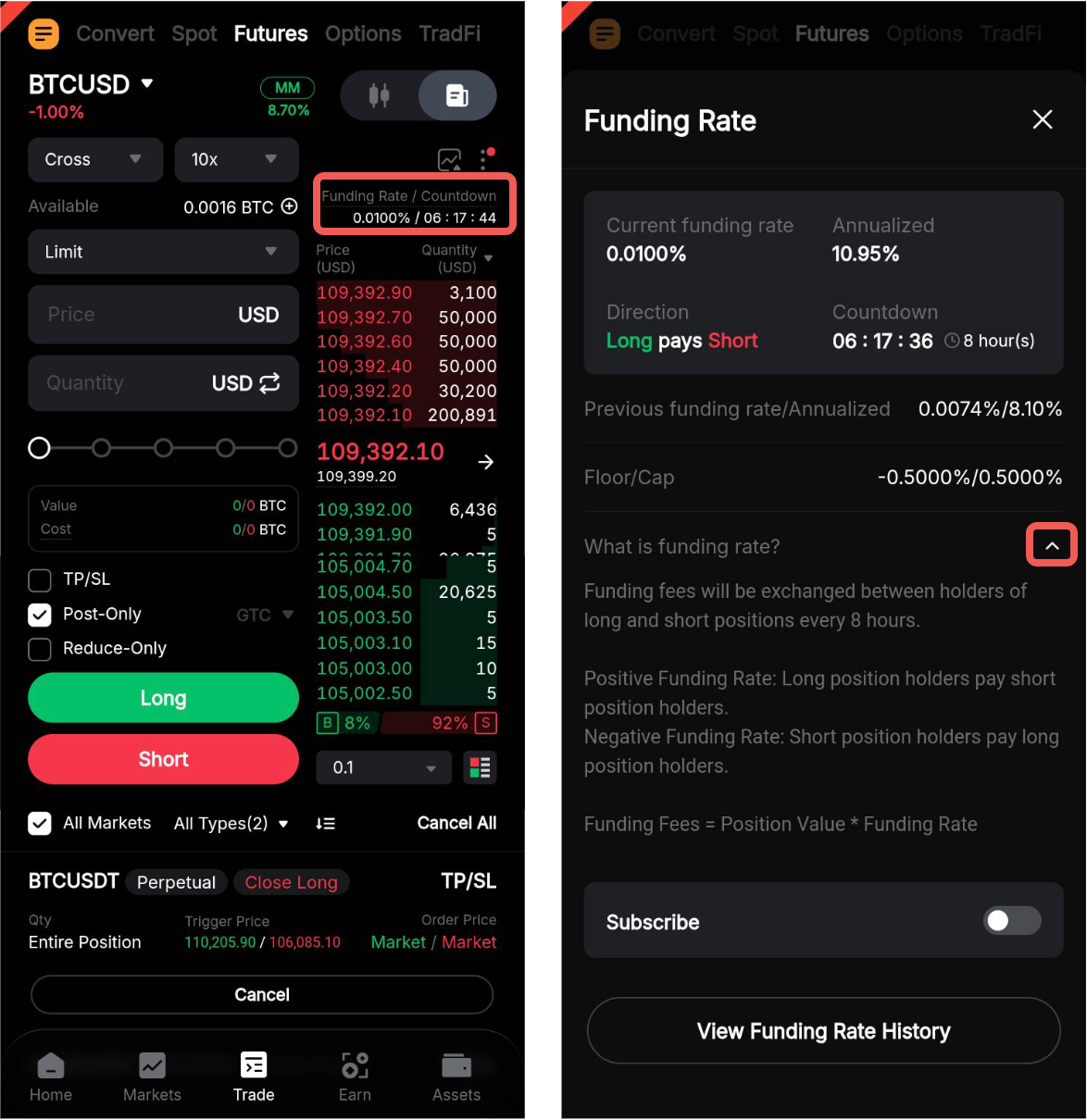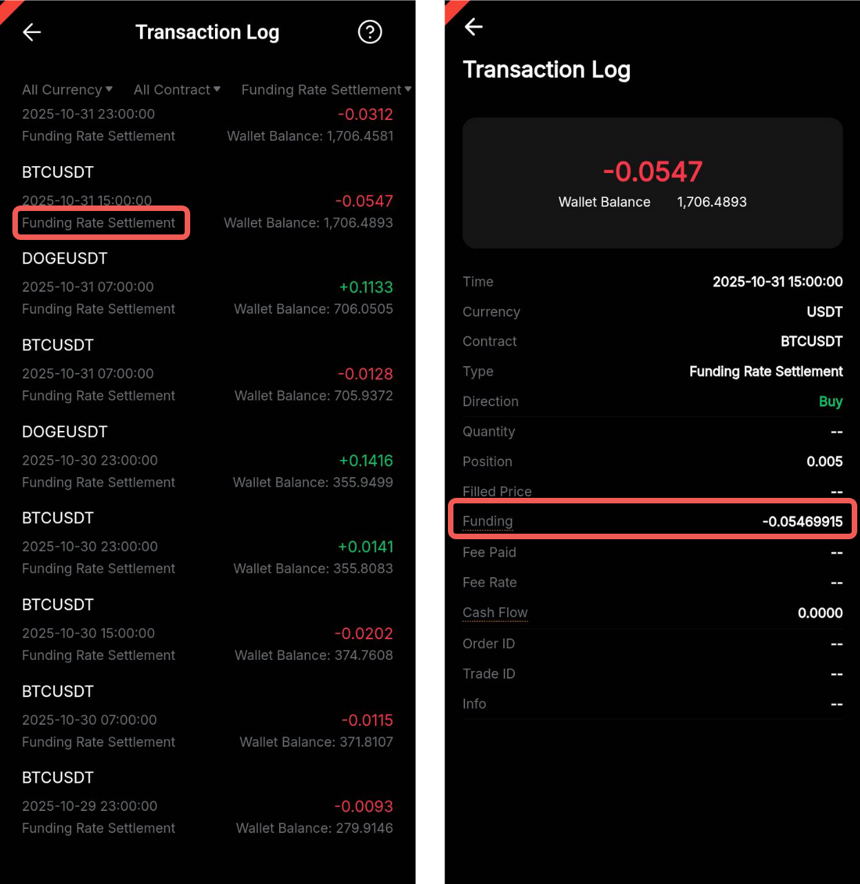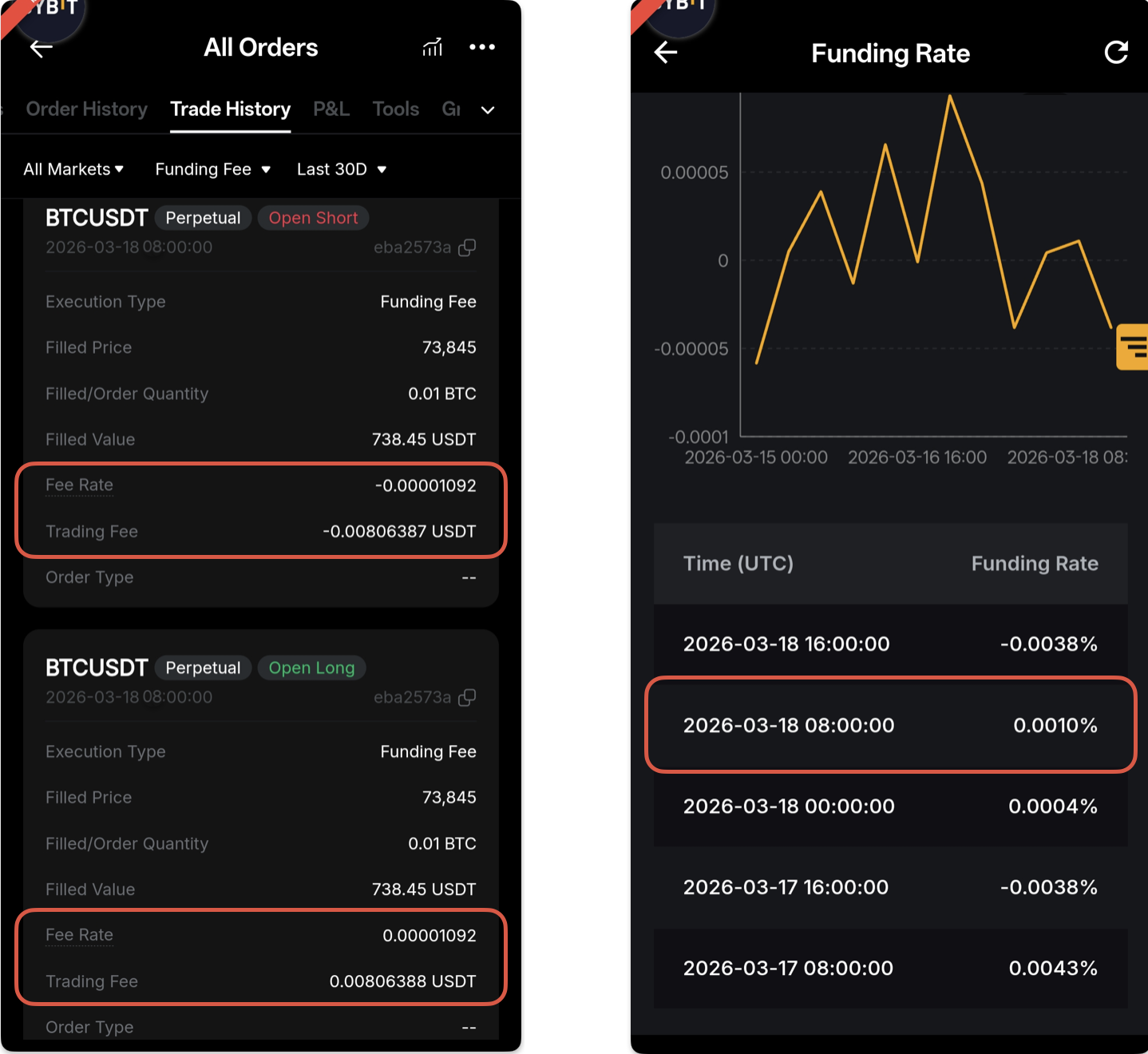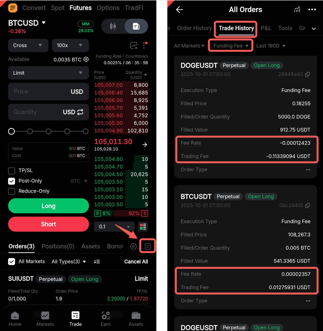 Di halaman trading, ketuk ikon Riwayat dan beralih ke tab Riwayat Trading untuk melihat tingkat pendanaan dan biaya trading.