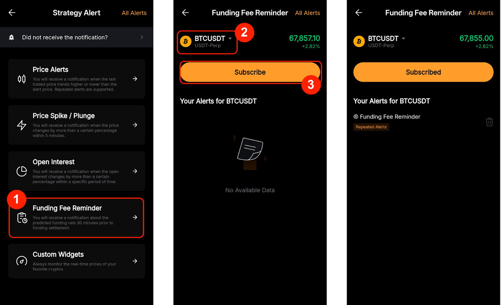 Langkah 2: Di halaman Peringatan Strategi, pilih Pengingat Biaya Pendanaan. Pilih pasangan trading yang ingin Anda langgani, lalu ketuk Berlangganan untuk menyelesaikan pengaturan.