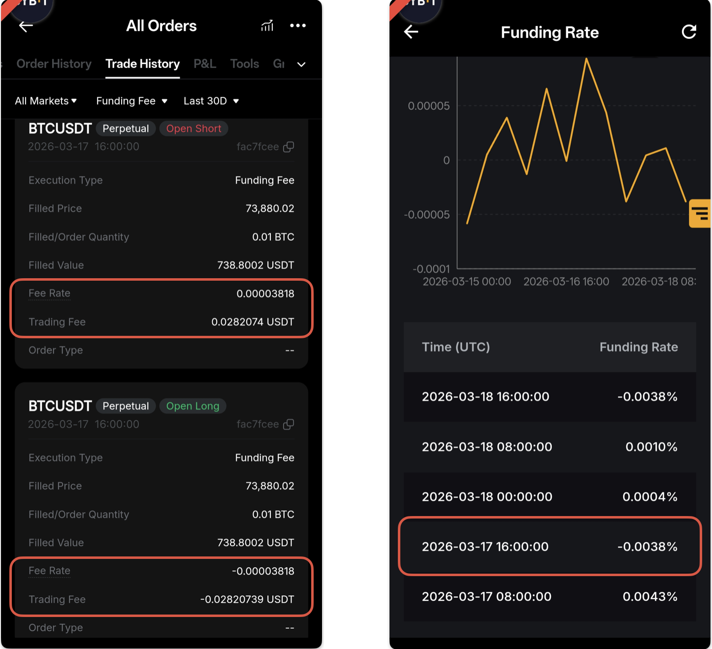 Asumsikan Trader A memegang posisi long dan short BTCUSDT. Catatan biaya pendanaan yang ditampilkan di Riwayat Trading akan muncul sebagai berikut: