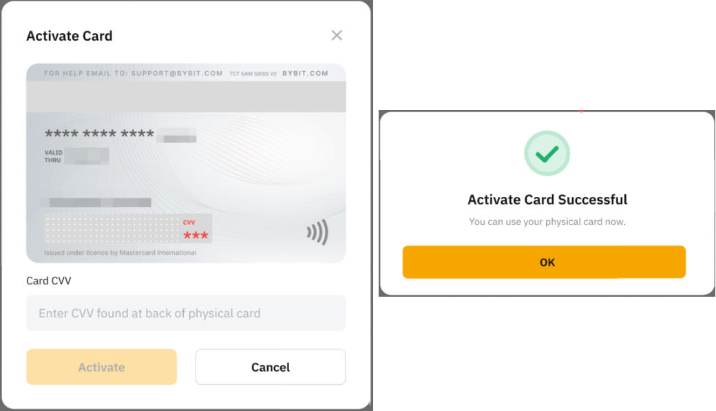 Langkah 5: Masukkan CVV 3 digit di bagian belakang Kartu Bybit fisik Anda dan klik Aktifkan dan sekarang Anda dapat menggunakan Kartu Bybit fisik Anda! Jika belum memberikan Nomor Ponsel dan Alamat Penagihan, Anda harus memasukkan informasi sebelum memasukkan CVV.