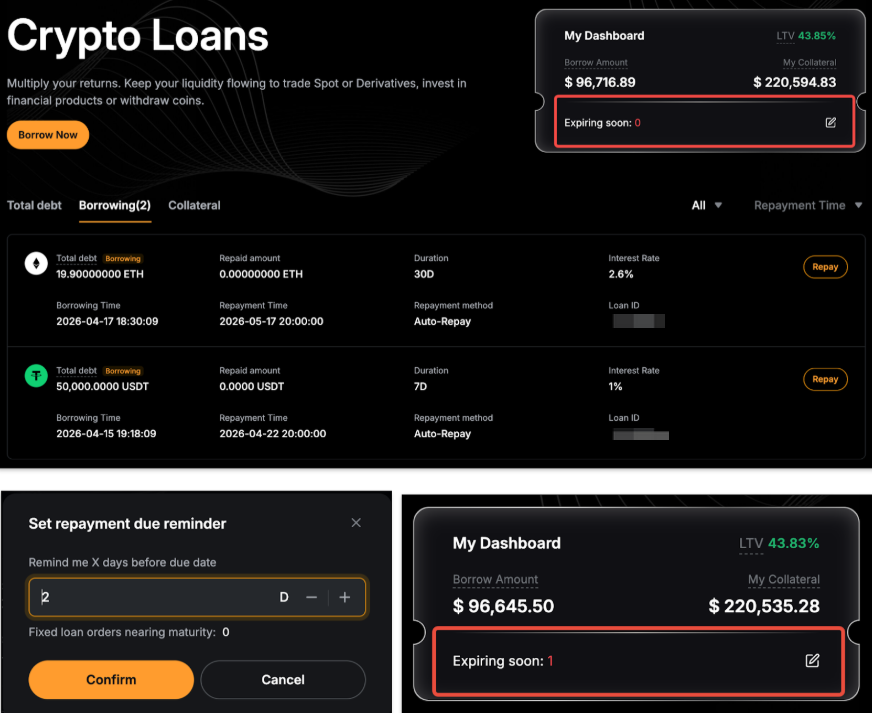 — Anda dapat mengaktifkan pengingat "batas waktu pelunasan" dari halaman beranda Pinjaman Kripto. Klik ikon Edit di sebelah Segera berakhir di Dasbor Saya, lalu atur berapa hari sebelumnya Anda ingin diberi tahu. Saat pelunasan mendekati batas waktu, jumlah pinjaman yang akan berakhir akan ditampilkan di sebelah Segera berakhir.