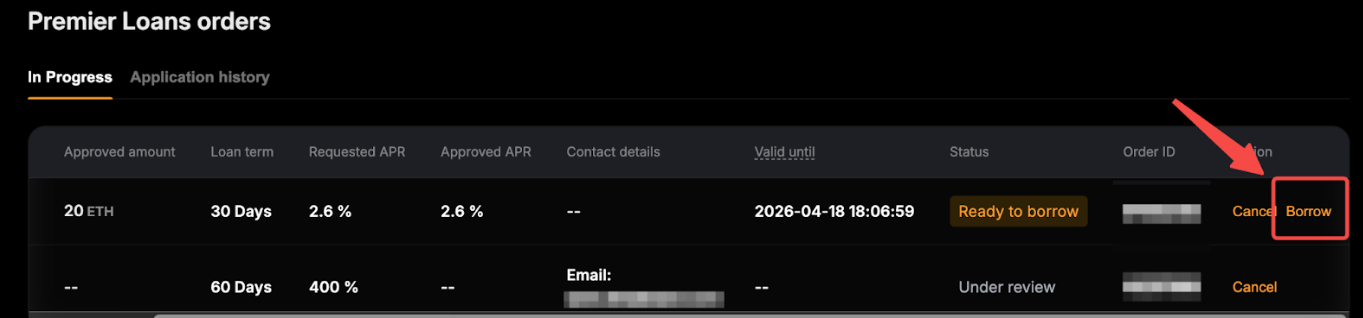 Langkah 1: Setelah aplikasi Anda disetujui, buka tab Sedang Berlangsung dan klik Pinjam di paling kanan aplikasi untuk memulai.