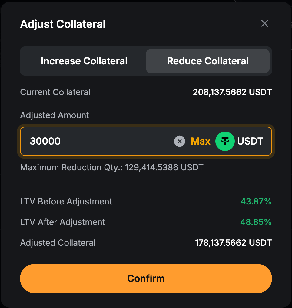 Jika Anda ingin mengubah aset agunan atau menambahkan lebih banyak agunan, klik ikon "+" di bagian agunan. Lakukan penyesuaian Anda, lalu klik Konfirmasi untuk menerapkan perubahan. Anda juga dapat menyesuaikan agunan Anda kapan saja dari dasbor Pinjaman Kripto.