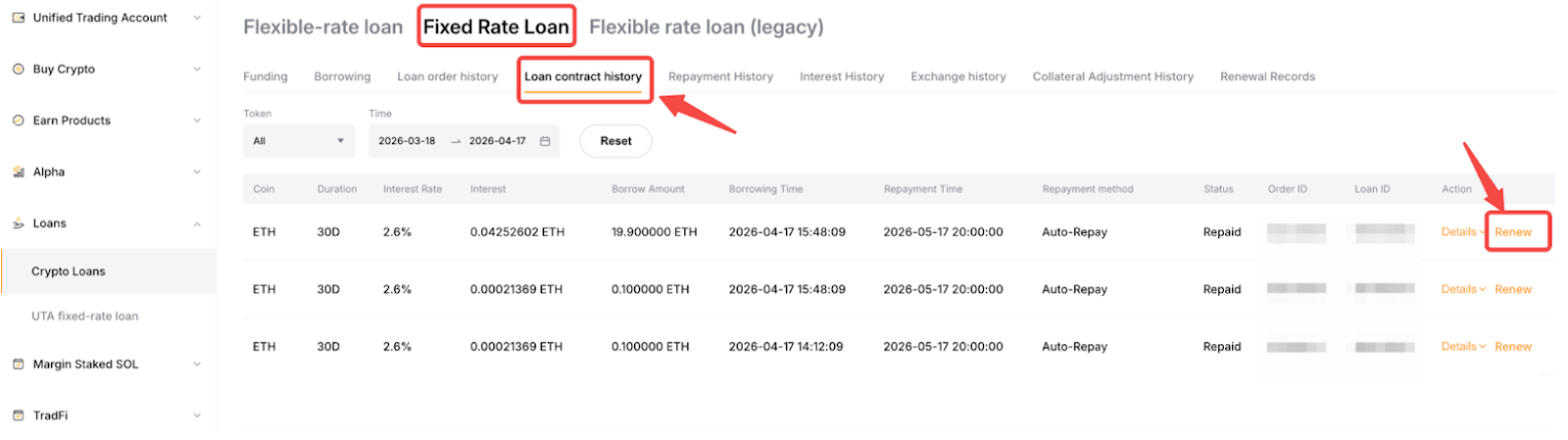 Untuk pesanan yang telah dilunasi sepenuhnya: Buka halaman Pesanan → Riwayat kontrak pinjaman, lalu temukan pinjaman yang telah dilunasi sepenuhnya yang ingin Anda perbarui dan klik Perbarui.
