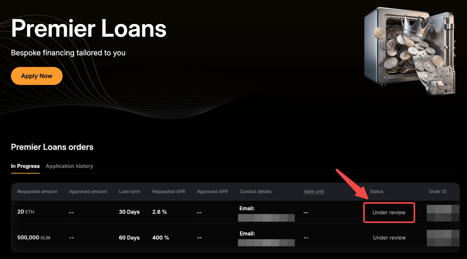 Untuk melihat aplikasi Anda, pergi ke halaman utama Premier Loans, di mana Anda akan melihat dua tab: