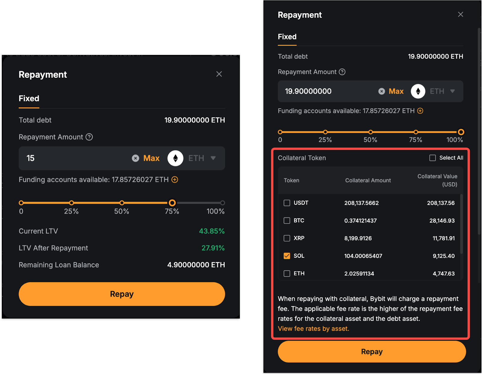 Jika Anda memilih untuk melunasi pinjaman menggunakan aset kolateral, biaya pelunasan akan berlaku. Tarif biaya yang dikenakan adalah yang lebih tinggi antara tarif biaya pelunasan untuk aset kolateral dan aset yang dipinjam. Nilai kolateral yang digunakan untuk pelunasan ditentukan oleh tingkat konversi kolateral, yang didasarkan pada harga indeks dari kedua aset tersebut.