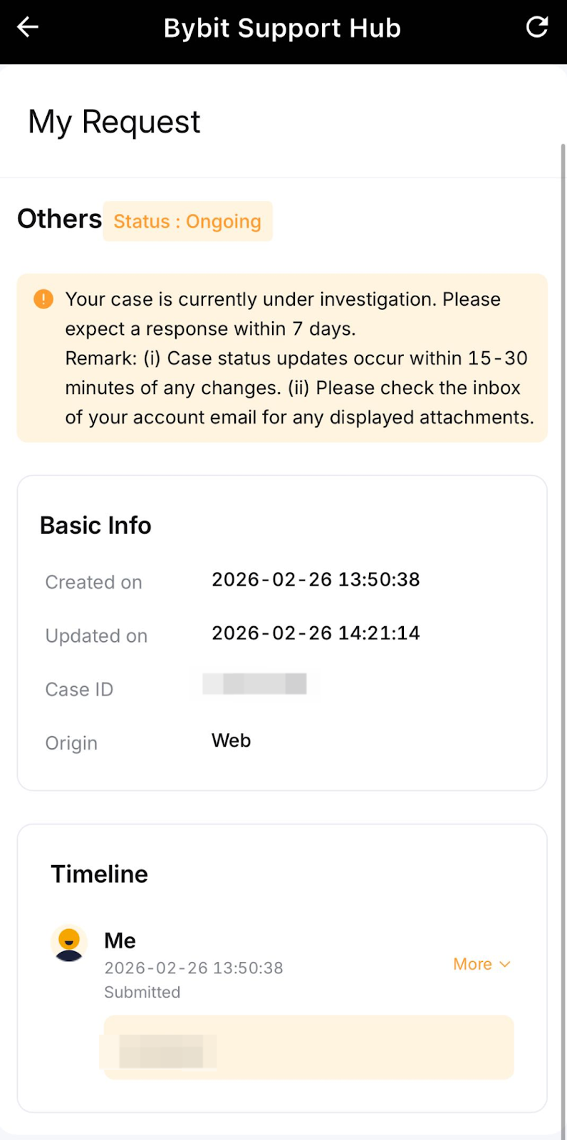 Setelah mengirimkan tiket dukungan, Anda dapat menggunakan Pusat Dukungan Bybit untuk memantau statusnya secara waktu nyata tanpa hanya mengandalkan notifikasi email. Dasbor terpusat ini menampilkan semua kasus Anda yang terbuka dan pembaruan dan memungkinkan interaksi langsung dengan tim dukungan kami.