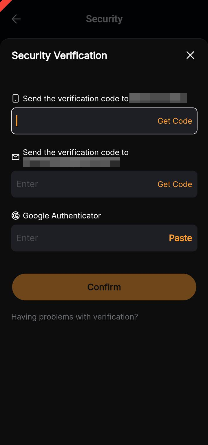 Langkah 2: Anda akan diminta untuk menyelesaikan proses Verifikasi Keamanan. Ketuk berbagai tombol Dapatkan Kode untuk mengambil kode yang dikirimkan ke nomor ponsel dan alamat email Anda saat ini. Setelah memasukkan kode verifikasi yang diperlukan beserta kode verifikasi Google 2FA, klik Langkah Berikutnya.