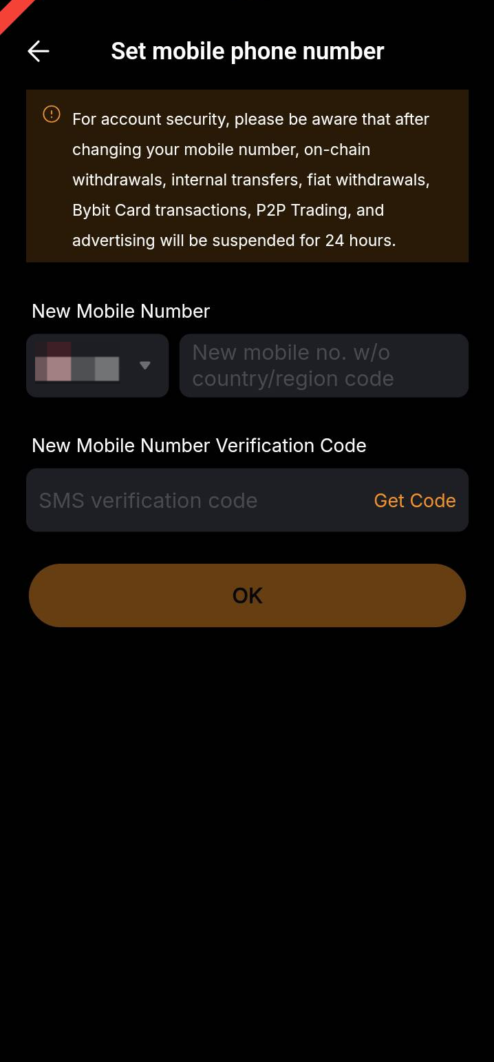 — Penarikan Kripto & Fiat, transfer internal, transaksi Kartu Bybit, perdagangan dan iklan P2P akan dibatasi selama 24 jam setelah mengubah nomor ponsel Anda.