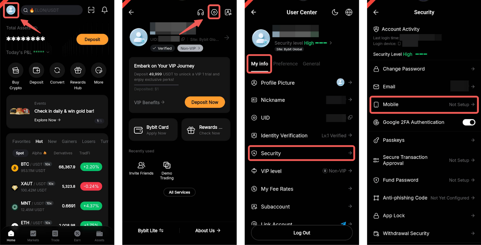 Langkah 1: Buka Profil di beranda Bybit dan ketuk ikon Roda Gigi di sudut kanan atas untuk mengakses halaman Pusat Pengguna. Kemudian, di bawah tab Info Saya, buka Keamanan → Ponsel untuk mengakses pengaturan ponsel Anda.